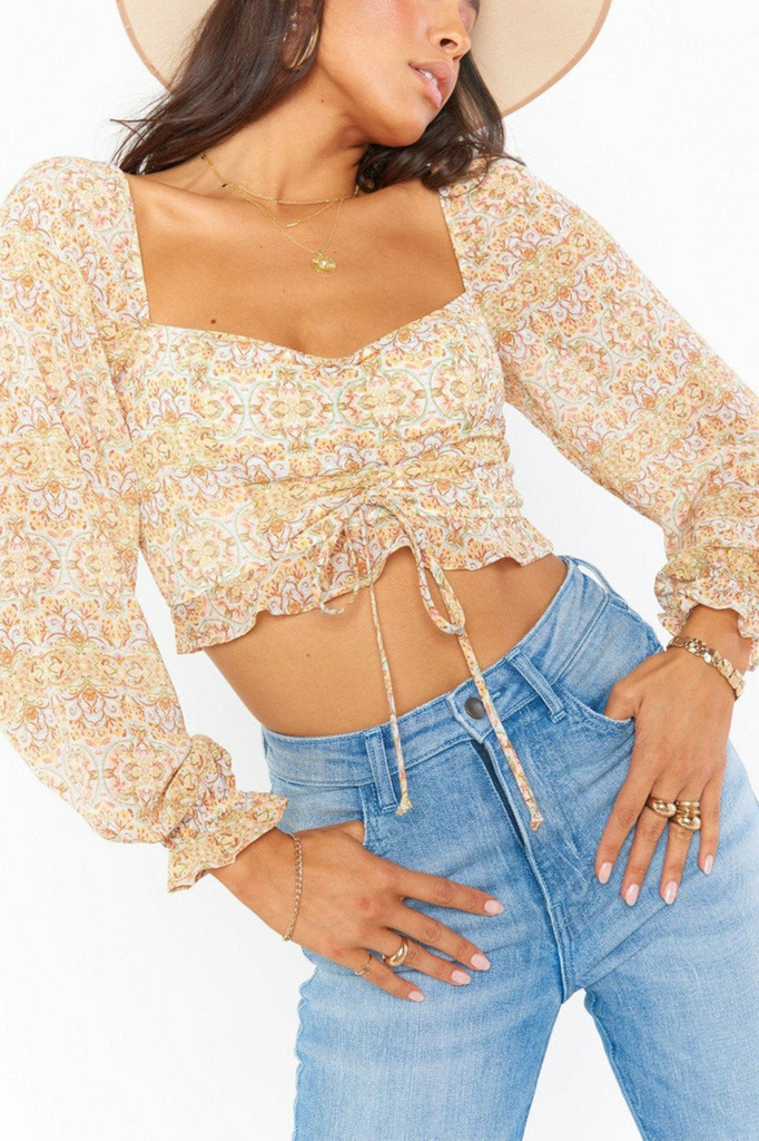 The Rivington Top from Show Me Your Mumu is a lightweight cropped blouse.Β It features ruched drawstring at front and balloon sleeves with elastic cuff. Made in the USA.