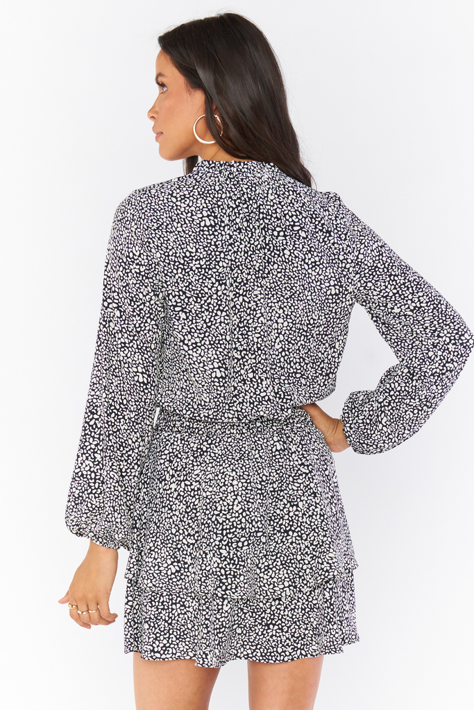 The Tatum Mini from Show Me Your Mumu. Pull-on styling. Keyhole neckline with tie closure and ruffle trim. Blouson sleeves with elastic cuffs. Smocked waist. Polyester blend.
